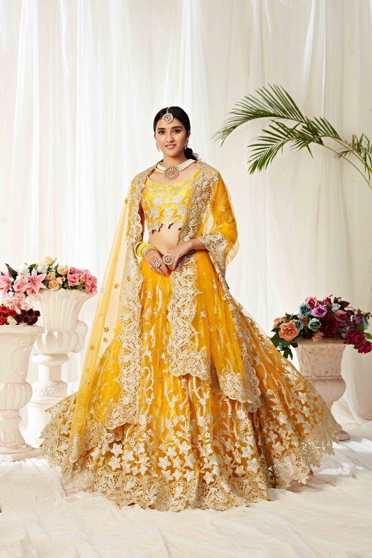 Crop-top lehengas are the latest addition to these typical choli style lehengas. Now you can give your lehenga a modern touch with a wide variety of crop-top lehengas trending this season. Whether it is a frill top with a unique style of sleeves or an off-shoulder elegant design, the range of classy and stylish crop-top lehengas are the perfect choice for any type of event. You can team them with matching accessories, and high-heels while keeping your hair open will flaunt your features.