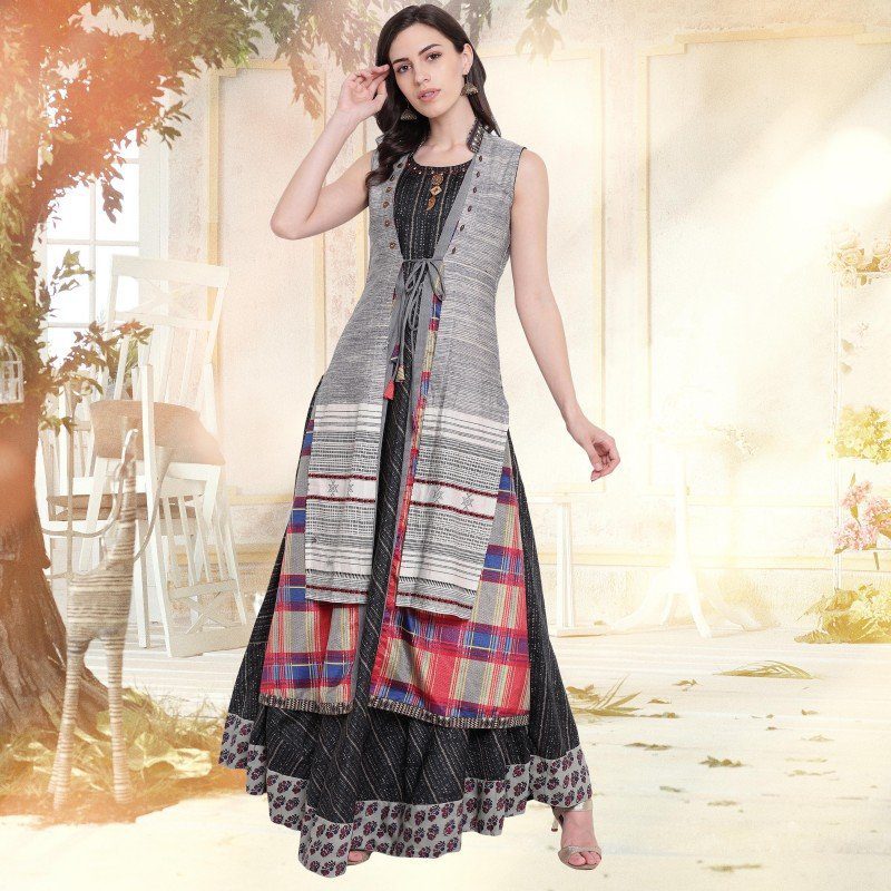 This elegant design adds a completely different look to your regular simple Kurti. The front cut or slit can be either on the front side or can either be waist high or thigh-high. Currently, these Kurtis are in fashion and the most prominent feature is that they can be paired up with leggings, jeggings, jeans, palazzos, and even dhoti style pants. A simple pair of earrings and elegant footwear will look amazing on it.
